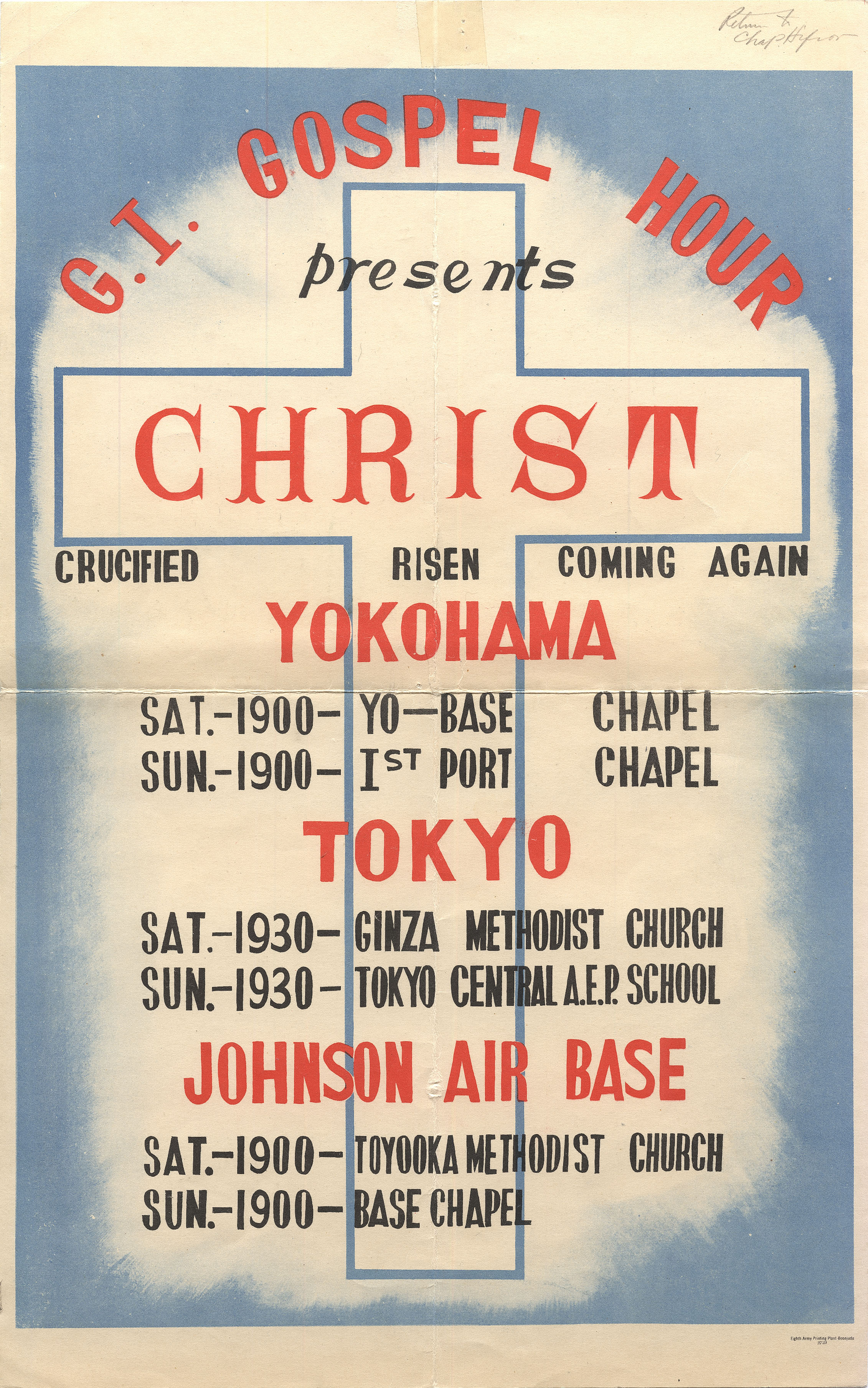 - Poster announcing GI Gospel Hour services in Yokohama, Tokyo, and at Johnson Air Base, c. 1946. As the Allied forces launched their campaign to sweep back over the Pacific during World War II, Christian soldiers and military chaplains began to establish a series of small Bible studies, prayer groups, and worship meetings in the secured territories. These initally informal efforts were eventually organized as "GI Gospel Hour" groups, often suported by Youth for Christ efforts. Dimensions: 16" x 10".