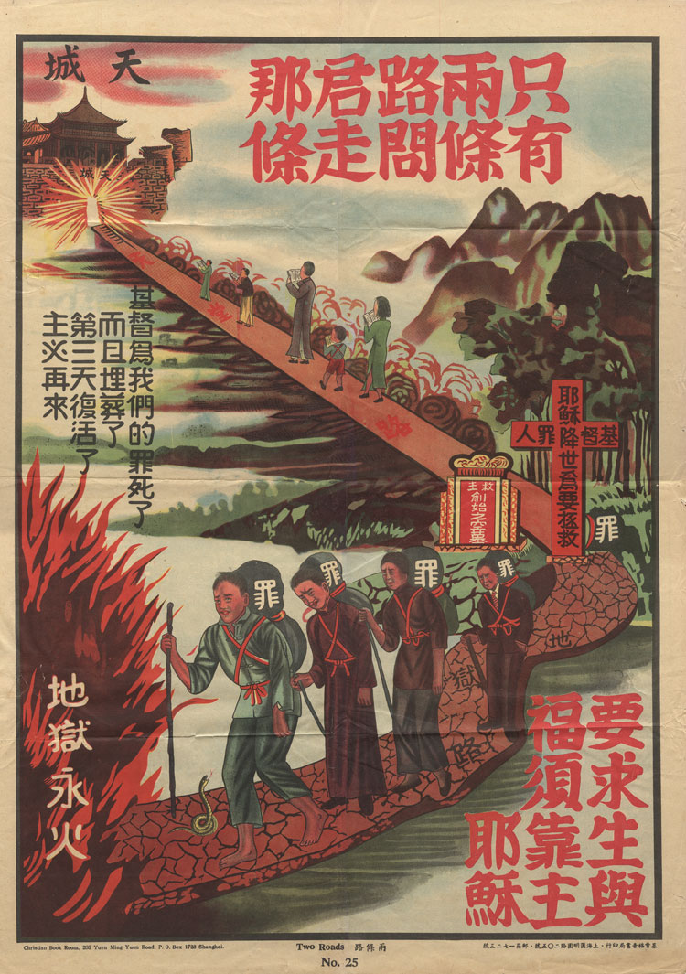 - "Two Roads." Undated. The English version of the Chinese text reads: "There are only two roads. I respectfully ask you, Which one are you walking on? Christ died for our sins and was buried. The third day he came to life again. The Lord is certainly coming again. If you want to find life a blessing, trust the Lord Jesus." In the upper left corner, the city is labelled Heavenly City. The road leading up to it is labeled Road to Heaven. In the lower left corner, the fire is labeled Eternal Fires of Hell. The road leading to it is labeled Road to Hell. The Chinese character for sin is inscribed on the packs carried by individuals on the road to hell. The text on the red cross reads: Christ Jesus came to earth to save sinners. The text in the tomb to left of the cross reads: The tomb from which the savior rose. Published by the Christian Book Room, 205 YuenMong Road, P.O. Box 1723, Shanghai.
