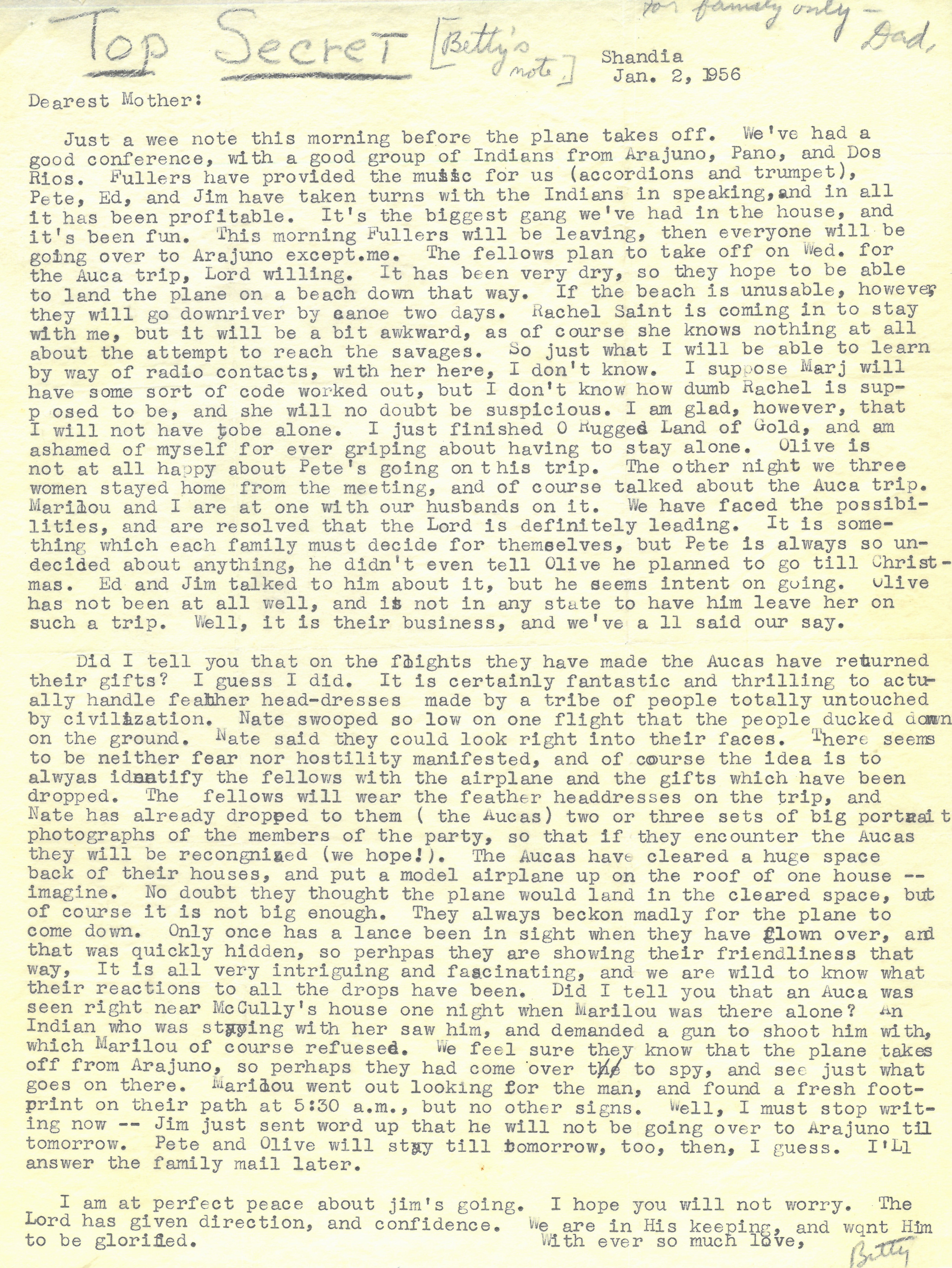 - January 2, 1956 letter from Elisabeth Elliot to her mother detailing the beginning of efforts by her husband Jim and four other missionaries to initiate direct contact with the Waorani.