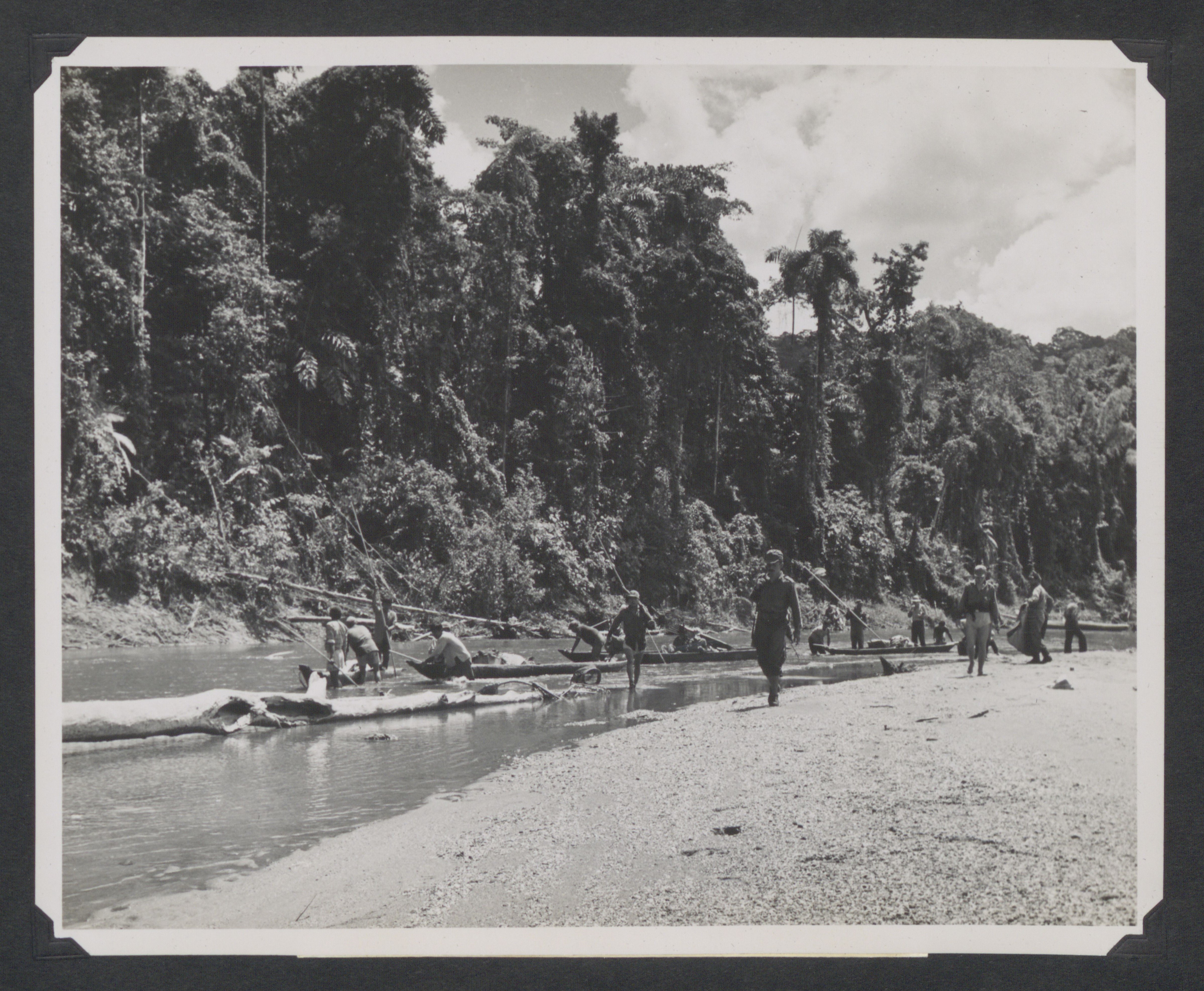- Team of Ecuadorian soldiers, Quichua Indians, and missionaries conduct ground search for missionaries by canoe down Curaray River. Original USCARIB Central caption reads: "Ground party personnel, consisting of Ecuadorian soldiers, American missionaries, and friendly Indians, search along the banks of the Curaray River in the upper Amazon basin of Ecuador for the bodies of the five American missionaries murdered by savage Auca Indians. Four of the bodies were subsequently recovered and buried in a common grave beneath the tree house they had constructed alongside the sandy beach where they were murdered."