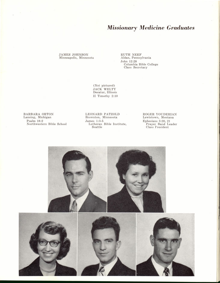 - Page 153 of the 1951 edition of The Scroll, the yearbook of Northwestern Schools in Minneapolis, Minnesota. The page includes the entry for Roger Youderian, who graduated that year from the Missionary Medicine program. The previous year he had graduated from their undergraduate program.