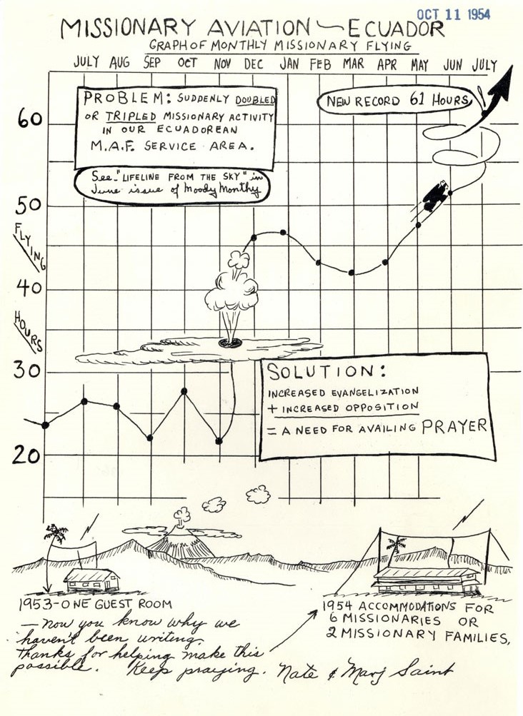- Prayer letter sent by Nate and Marj Saint to the supporters of their ministry. Most missionaries sent these out regularly, sometimes monthly. This letter is unusual in being almost completely graphic, showing Nate’s increased flying hours. Paper, 8.5" x 11", 1 page.
