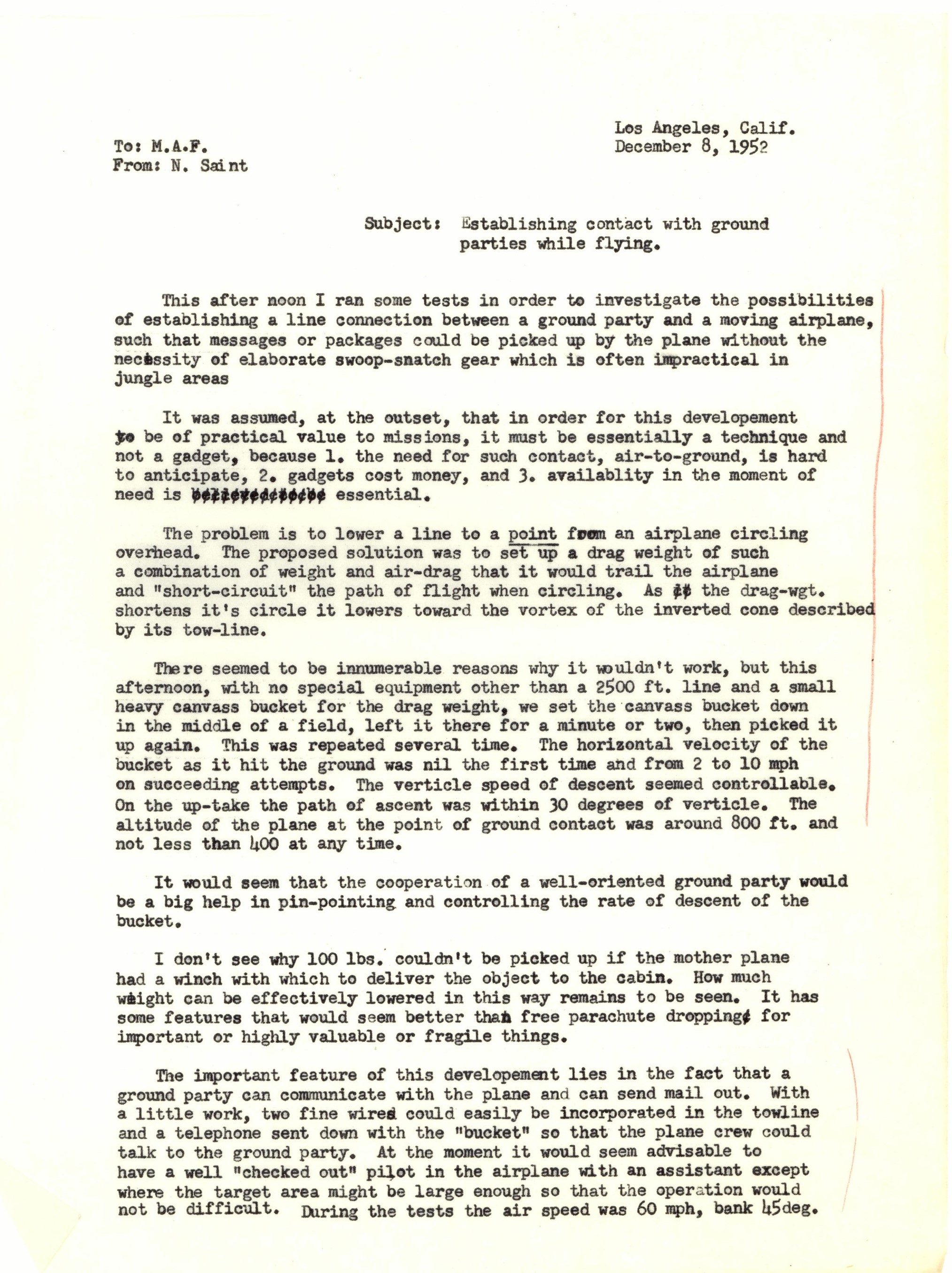 - Letter from Nate Saint to MAF central office about his experiments with a new method for establishing contact with the ground while flying using what he called a "bucket drop," December 1952.