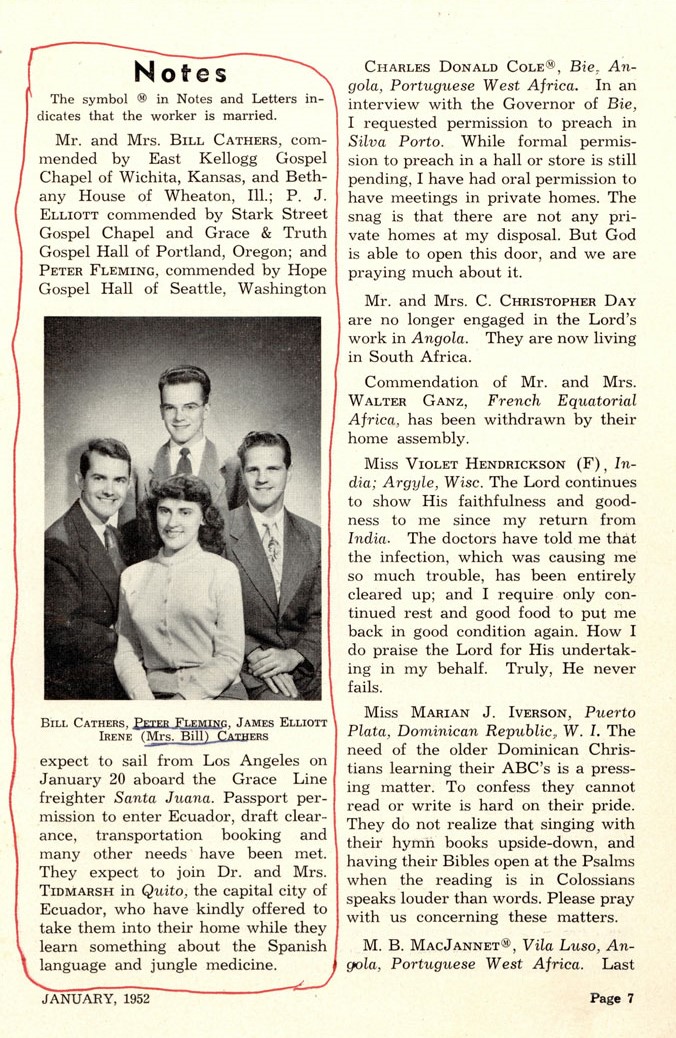 - Announcement of new missionaries Peter Fleming, Jim Elliot, and Bill and Irene Cathers, from page 7 of the January edition of The Fields, magazine of Plymouth Brethren mission work. The announcement describes Elliot and Fleming’s plans to sail to Ecuador. They actually left a little over two weeks after the date in the announcement. Paper, 6" x 9".
