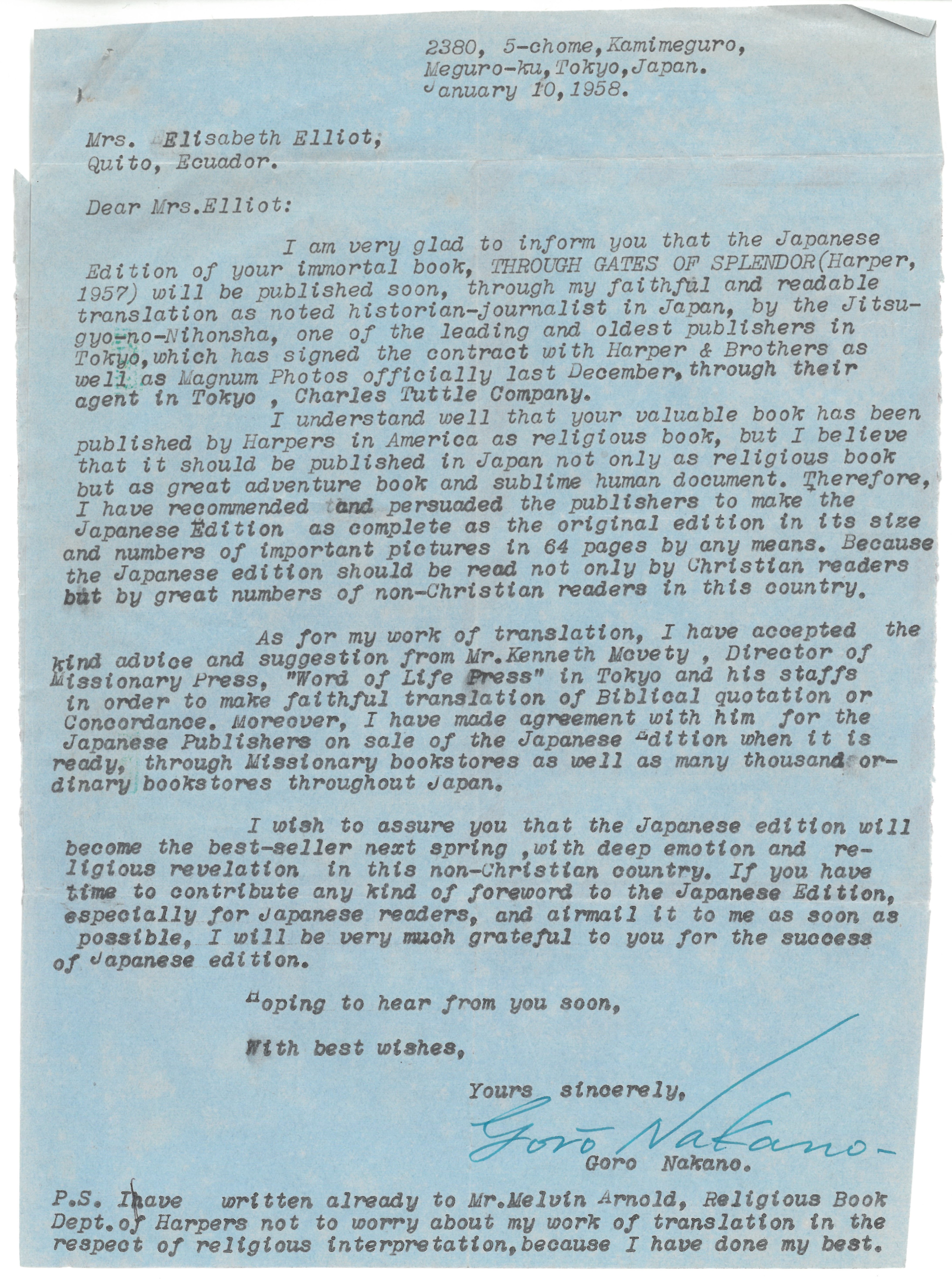 - Letter from Goro Nakano, Japanese journalist and historian, to Elisabeth Elliot regarding the Japanese edition of Through Gates of Splendor, January 1958. Nakano writes that while the book was published under Harper & Brothers' religious department, he "believe[s] it should be published in Japan not only as a religious book but as a great adventure book and sublime human document." In the years after its English release in 1957, Through Gates of Splendor was translated into many languages, including German, Portuguese, Russian, Turkish, Spanish, and Japanese.