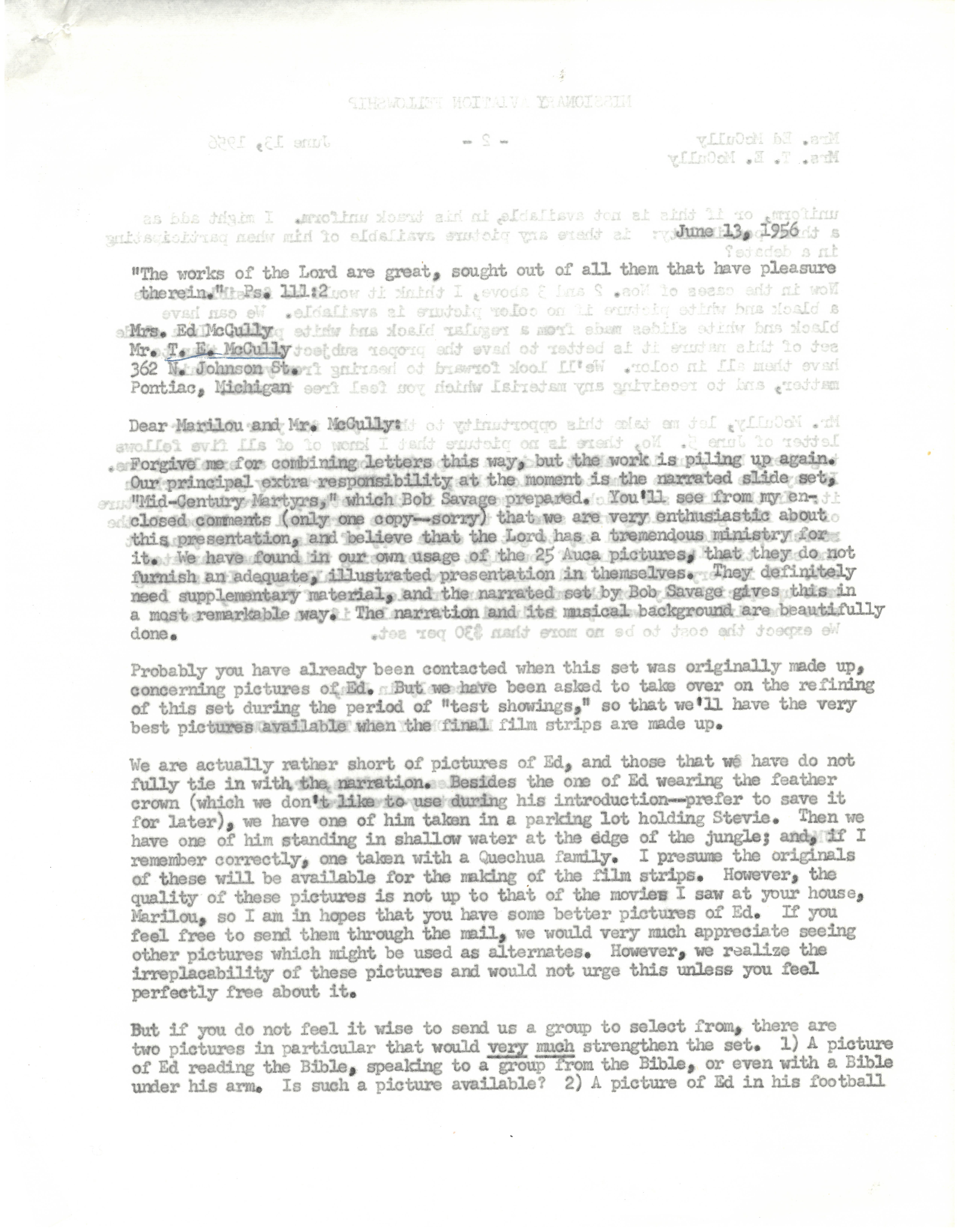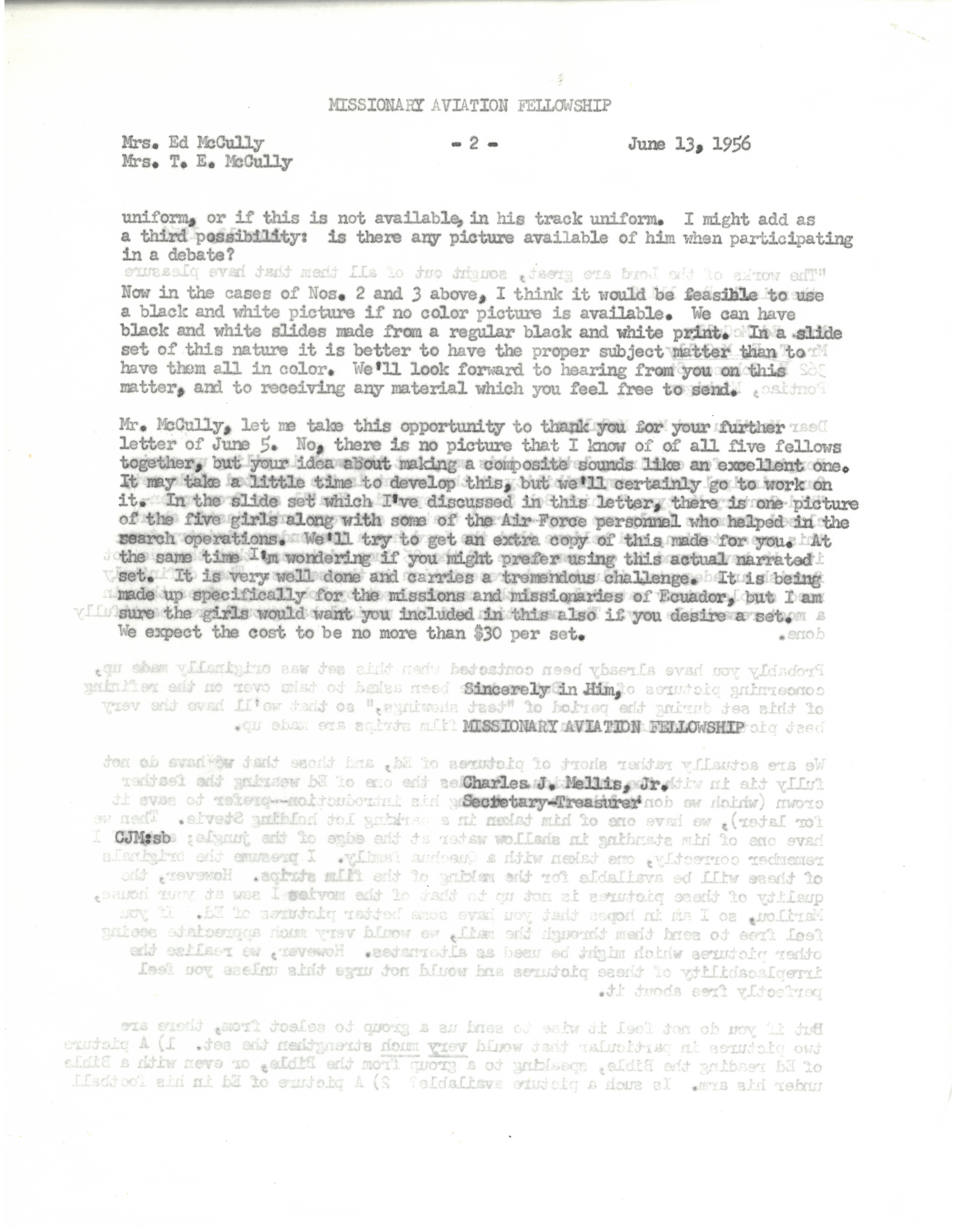 - Letter from Charles J. Mellis, secretary for Mission Aviation Fellowship, to Mr. and Mrs. McCully, parents of Ed McCully, June 1956, 2 pages. The letter concerns the development of a narrated slide set titled Mid-Century Martyrs originally arranged by Robert Savage, who worked with HCJB in Quito, Ecuador.