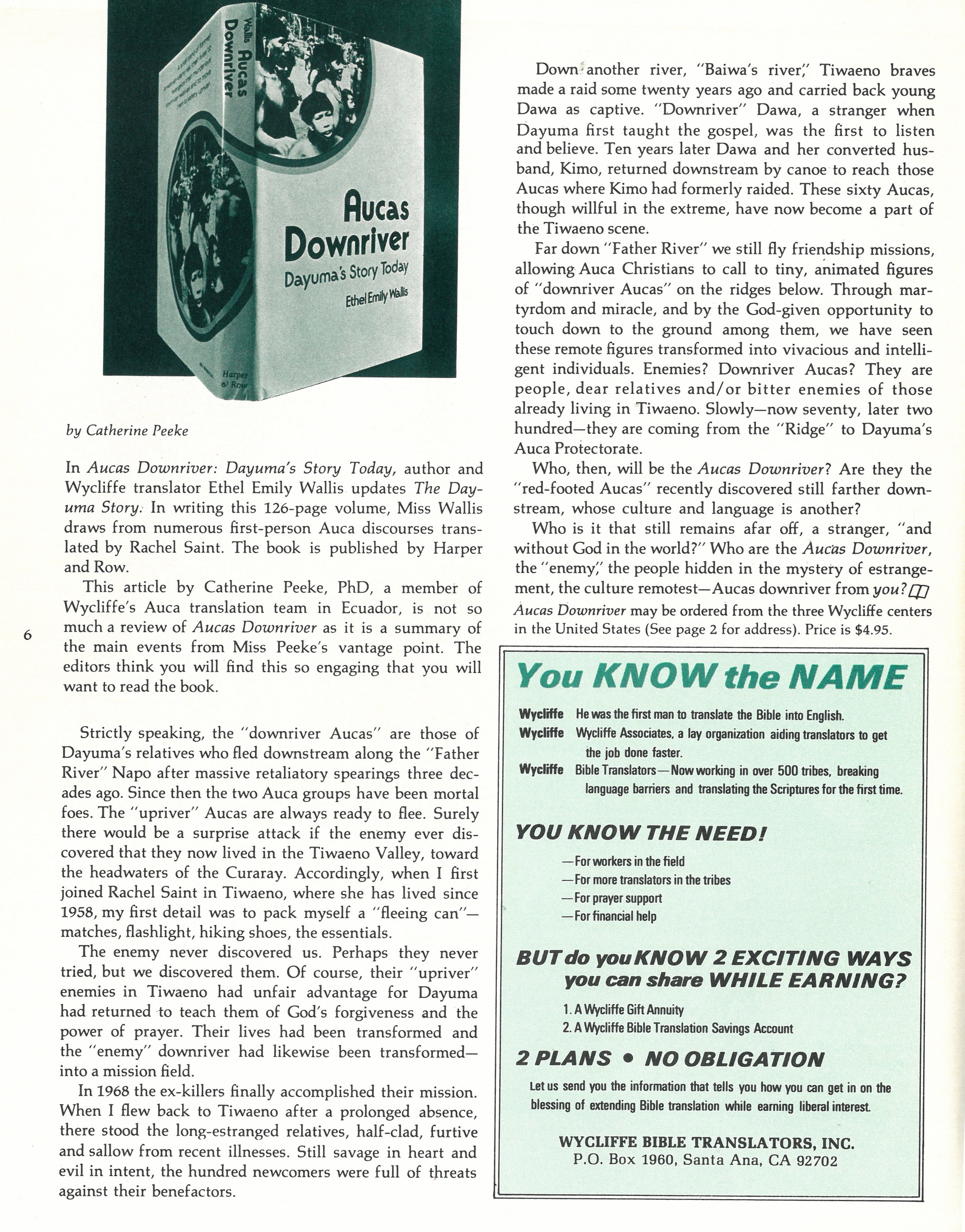 - Promotion of Ethel Emily Wallis's second book on Dayuma, Aucas Downriver: Dayuma's Story Today, accompanied by several paragraphs from Catherine Peeke reporting on current efforts to reach the "downriver" and "ridge" Waorani communities. Printed in the May 1973 issue of Translation, the journal of the Summer Institute of Linguistics and the Wycliffe Bible Translators.