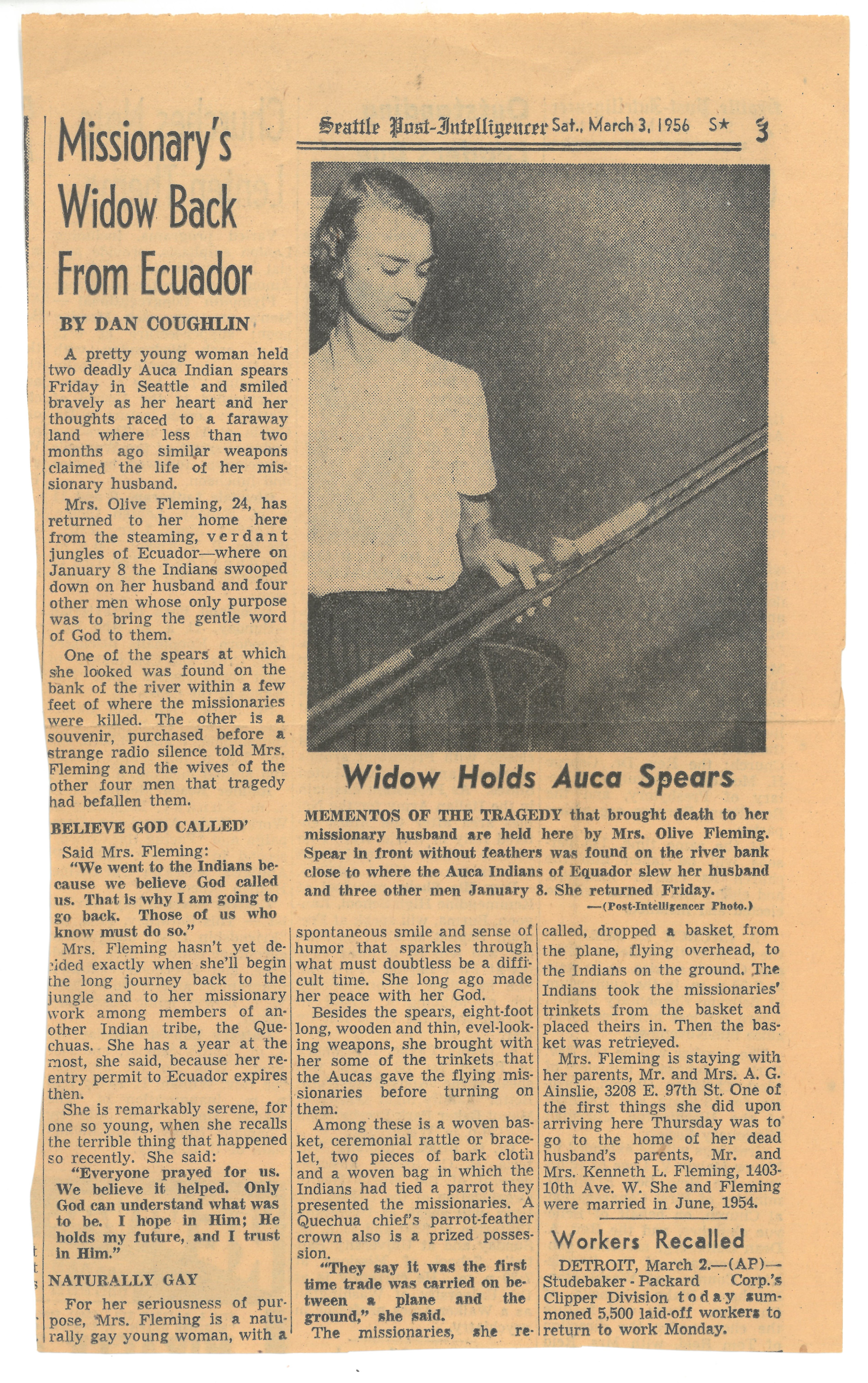 - Article in the Seattle-Post Intelligencer, March 3, 1956 reporting on Olive Fleming's return to Seattle two months after the death of her husband. Accompanying the article is a photograph of Olive holding two Waorani spears.