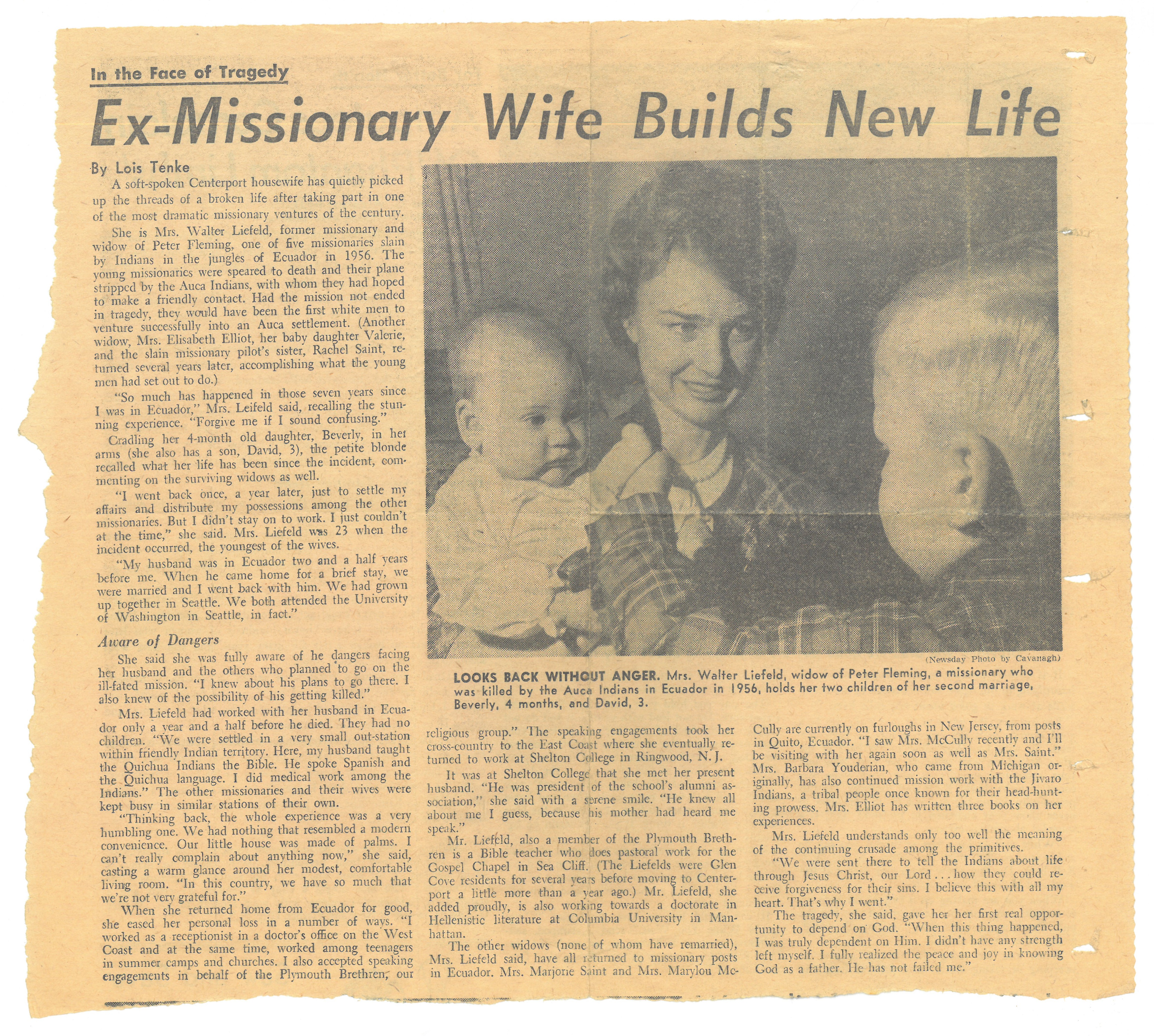 - Article titled "Ex-Missionary Wife Builds New Life" by Lois Tenke from unidentified publication (likely the Glen Cove Record Pilot). Tenke reports on Olive Fleming Liefeld's life in the United States seven years after the death of Peter Fleming, including her marriage to Walter Liefeld, ministry with the Brethren Gospel Chapel in Sea Cliff, Long Island, and birth of her two children. Clipping includes of photograph of Olive with son David and daughter Beverly.
