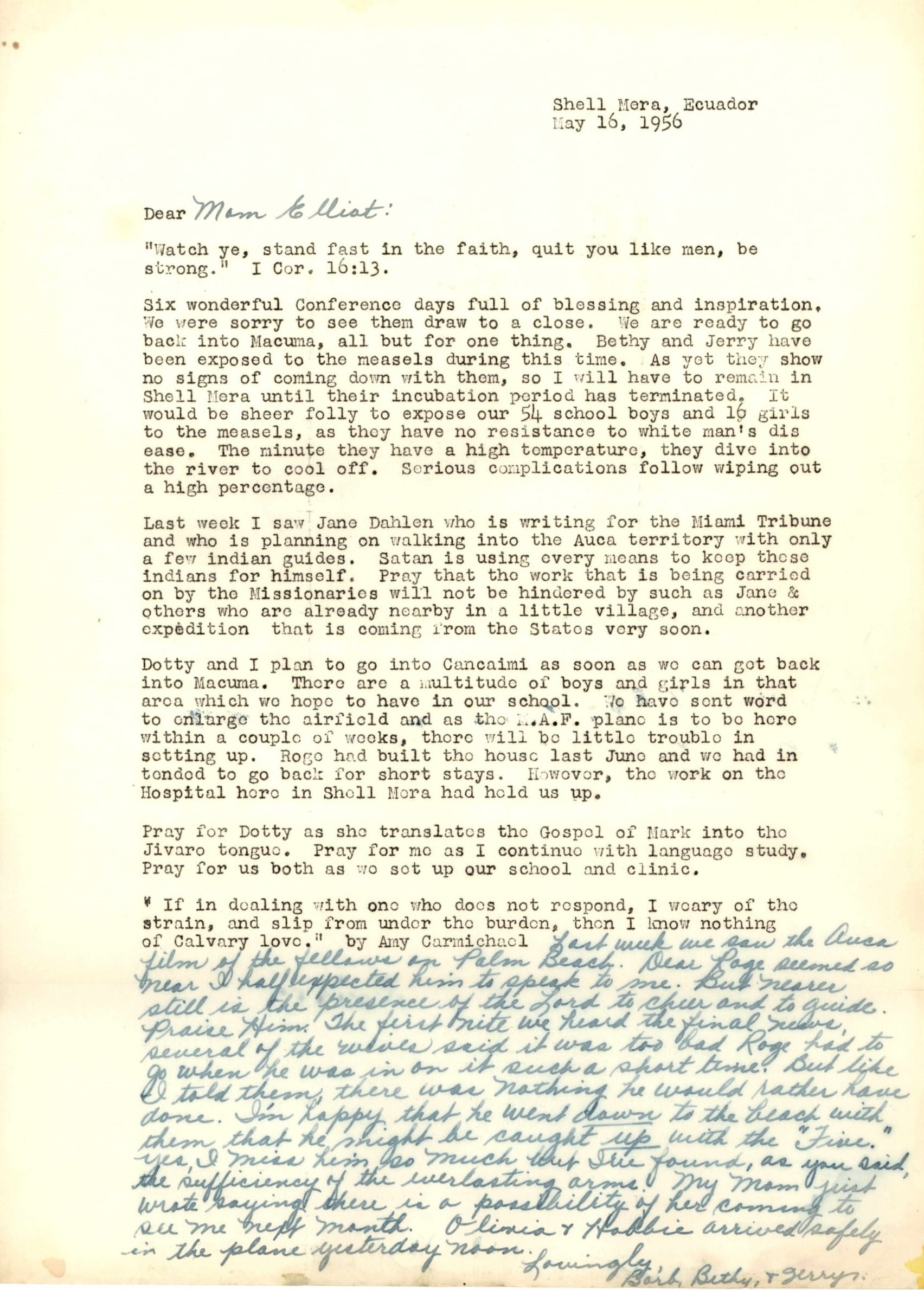 - Letter from Barbara Youderian to Fred and Clara Elliot with news of her plans to return to her mission work in Macuma, Ecuador, as well as her reflections on viewing the film footage recovered from "Palm Beach" for the first time.