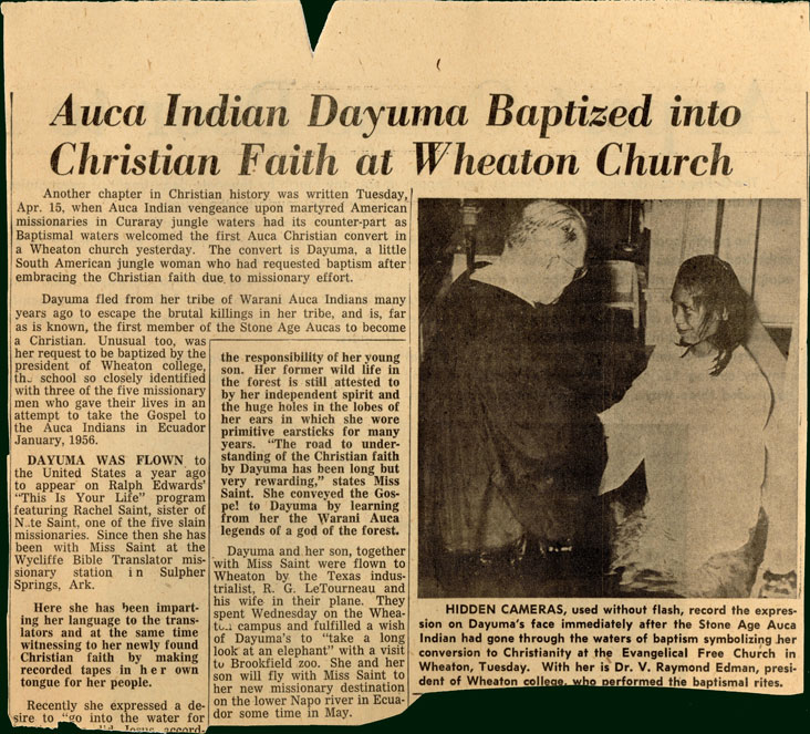 - A newspaper article, "Auca Indian Dayuma Baptized into Christian Faith at Wheaton Church," on Dayuma’s baptism at the Evangelical Free Church of Wheaton, IL in April 1958. The article also provides some background on Dayuma’s early life.