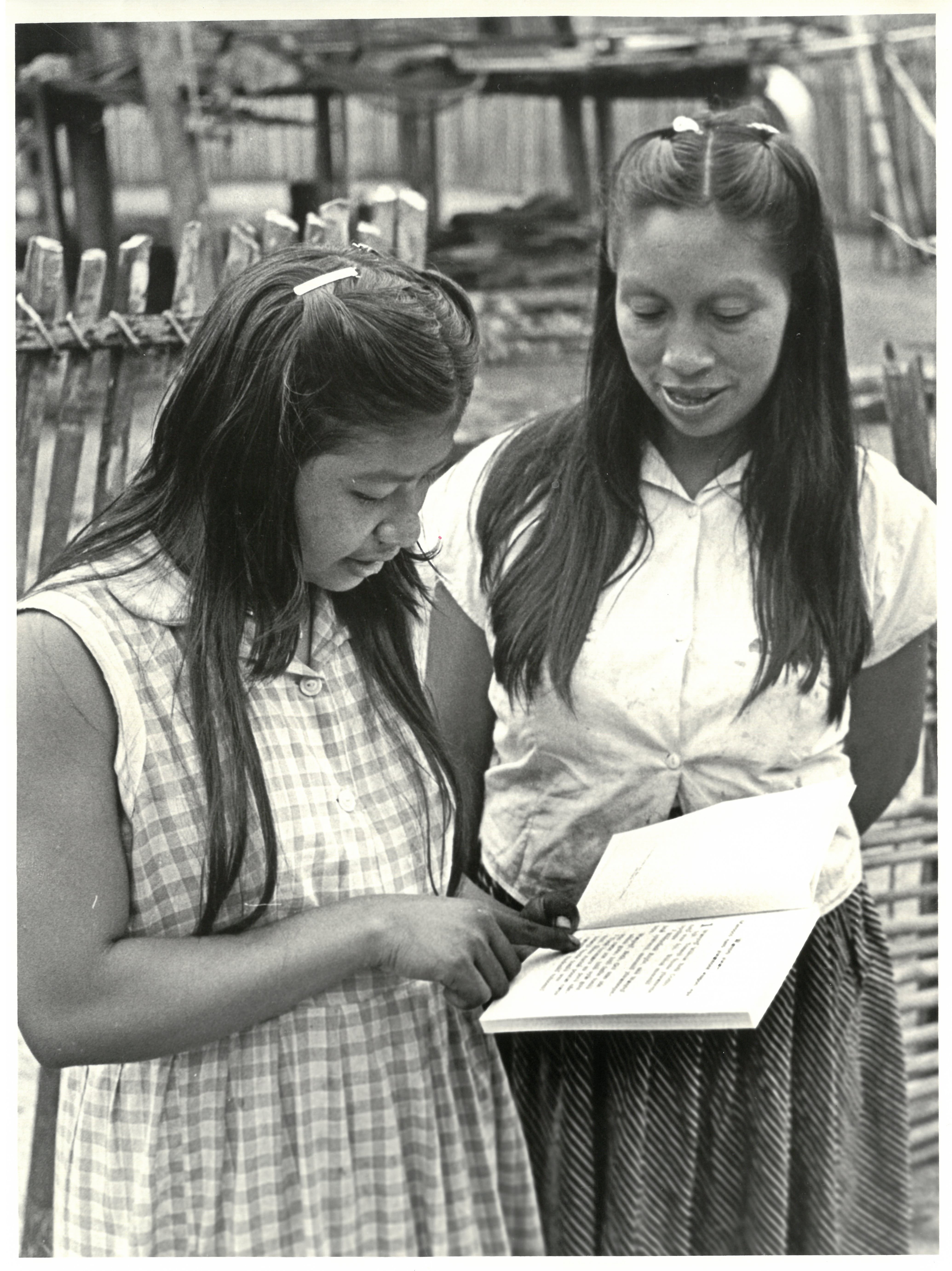 - Photograph of Oncaye (left) and Dayuma (right) in Tewæno. Caption from V. Raymond Edman reads: "Oncaye from downriver Aucas being taught from Mark by Dayuma in Tewæno. Oncaye prays to return to her people, helped by Dywi and Tonia." While the photograph depicts Oncaye and Dayuma reviewing a print of the Gospel of Mark translated into Wao tededo, Dayuma had only limited literacy and communicated Bible stories or verses mostly from memory.