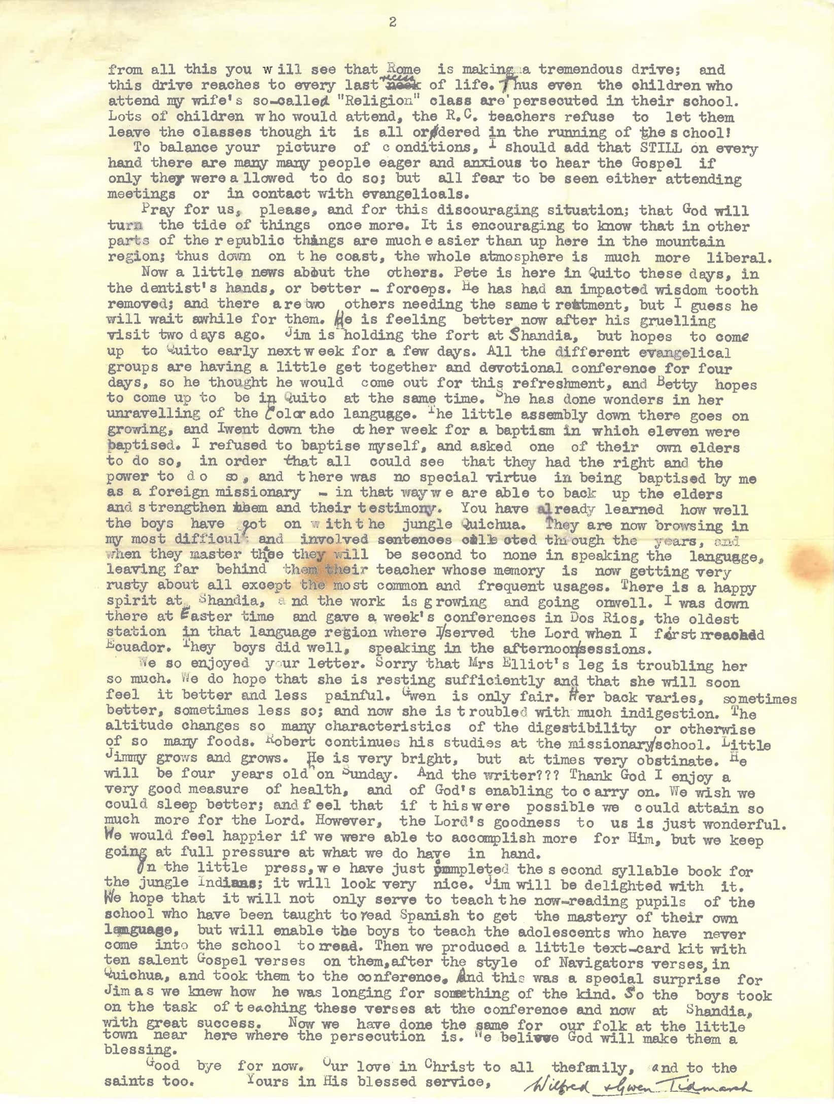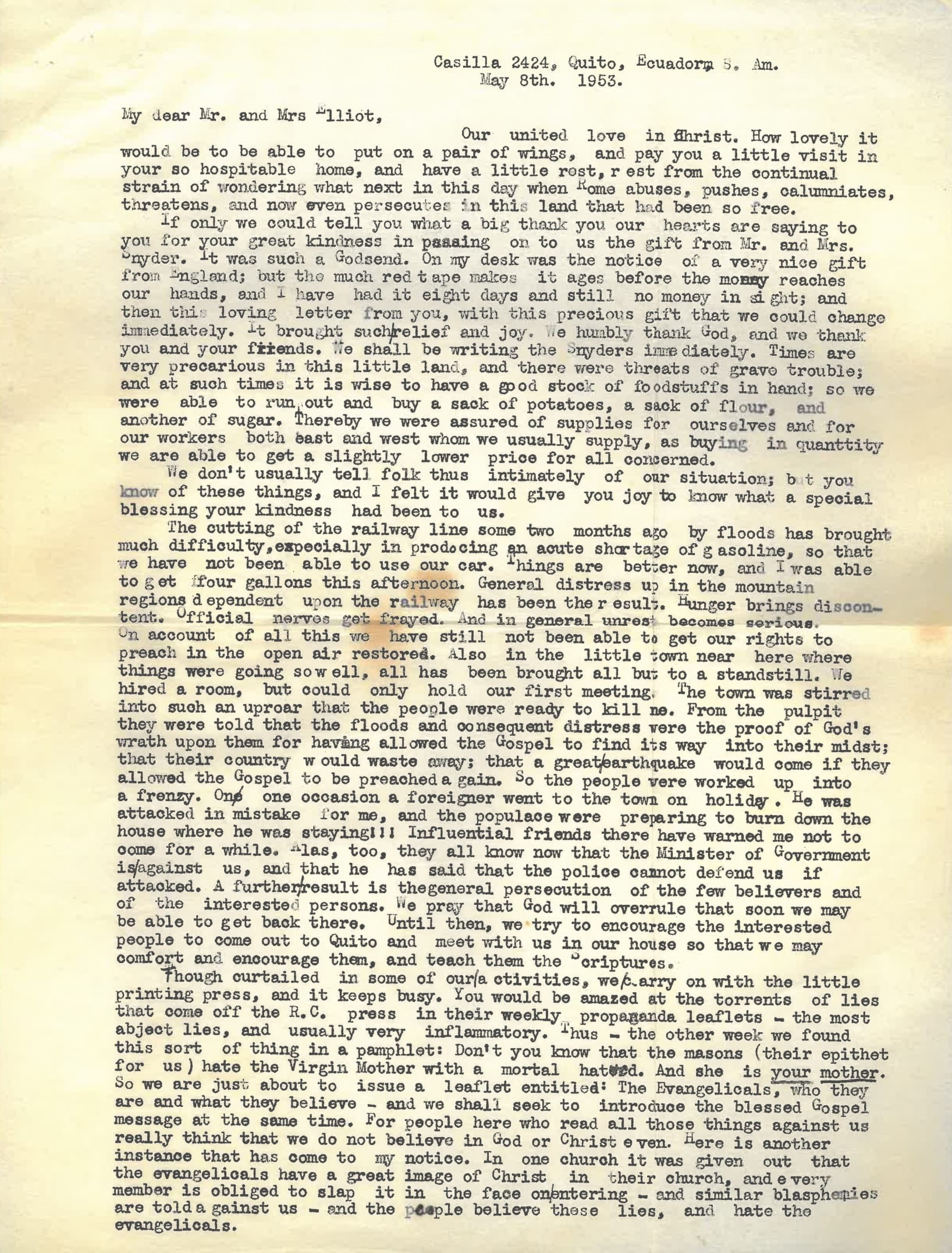 - Letter from Wilfred and Gwendolyn Tidmarsh to Fred and Clara Elliot (parents of Jim Elliot) with news of the various mission projects in Ecuador, along with personal news of Jim Elliot and Pete Fleming, c. May 1953. The letter also includes several references to conflict between the evangelical missionaries and the Catholic church and other officials in Ecuador.