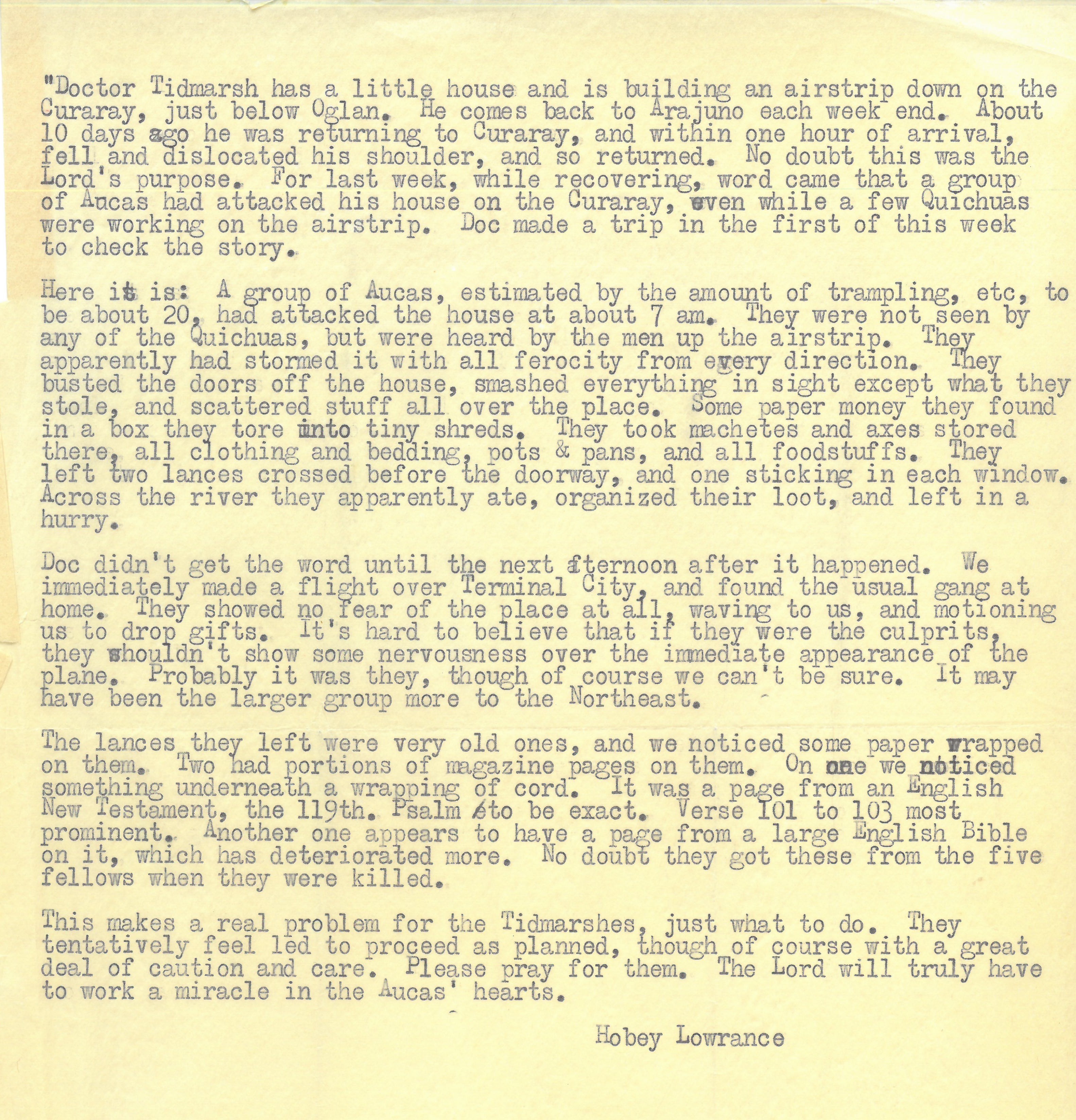 - One page report from Hobey Lawrence, MAF pilot, on the recent Waorani raid of Wilfred Tidmarsh's new outbuilding near Arajuno, around October 1957.