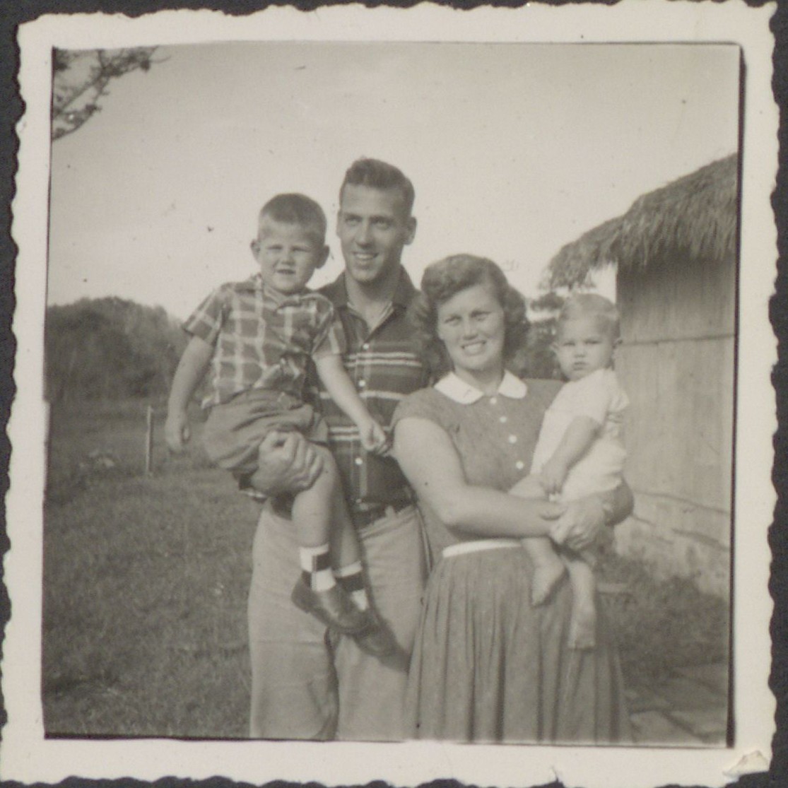 - Black and white photograph of Ed and Marilou McCully with their two oldest children, Steve and Mike McCully, c. 1955.