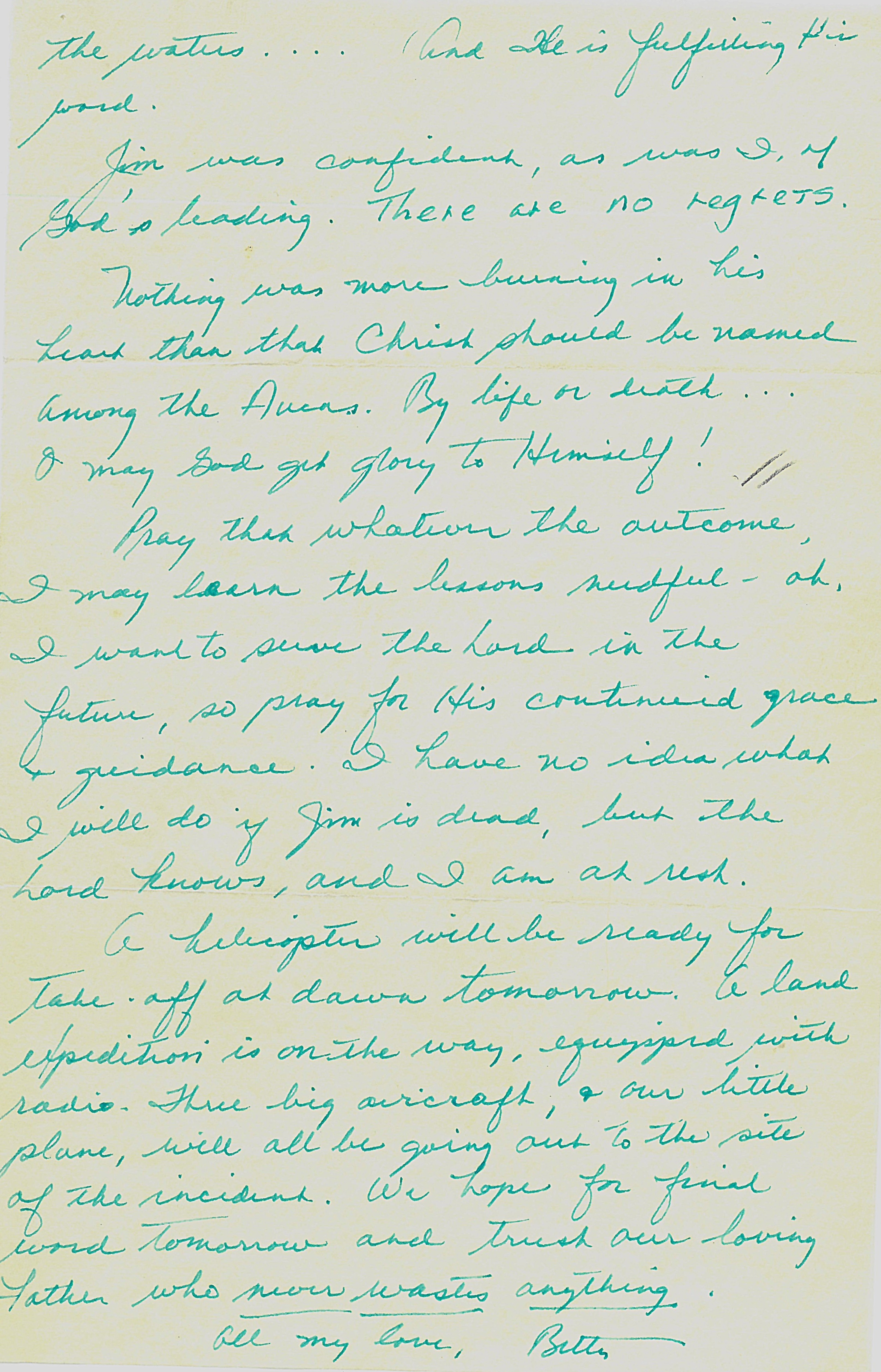 - Two page letter from Elisabeth Elliot to "Mother and Daddy Dear," January 11, 1956. Letter gives news of incoming search assistance from the U.S. Army, Navy, and Air Force out of the Canal Zone in Panama. She adds "I have no idea what I will do if Jim is dead, but the Lord knows, and I am at rest."