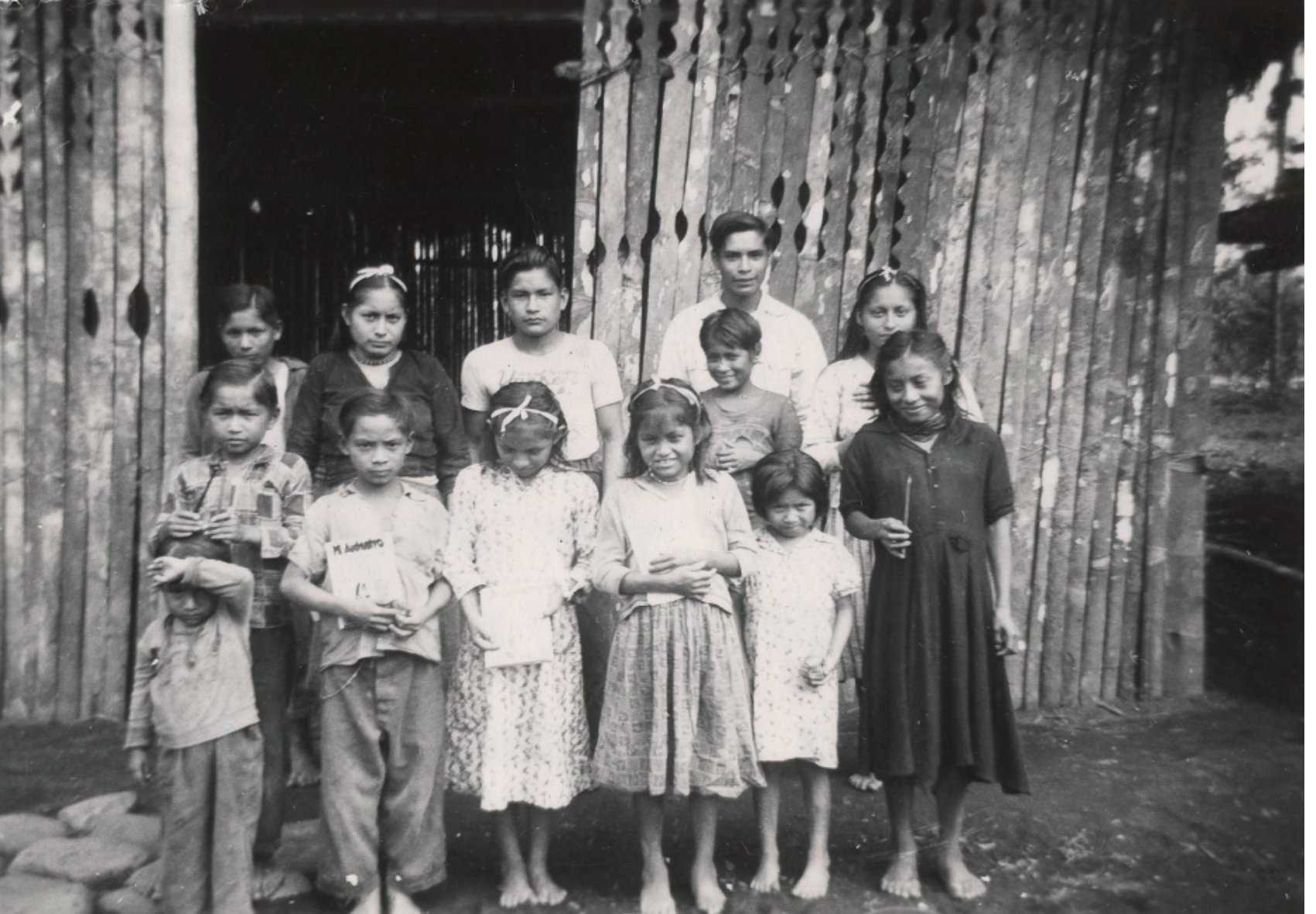 - Photograph of Quichua children at school in Puyupungu. Caption from Jim Elliot: "Our School Gang in Puyupungu. 2nd row 2nd from left is the girl we married this morning. Beside her is the boy who arrived for baptism and beside him is our believing teacher Lucas." Black and white photograph, 1.5x2.5 in.