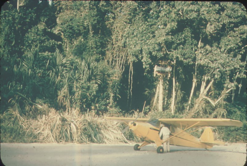 - View of tree house built by missionaries and Nate Saint's Piper Cub airplane on Palm Beach, January 1956. Color slide, 1x1 in.
